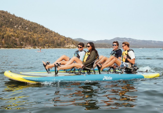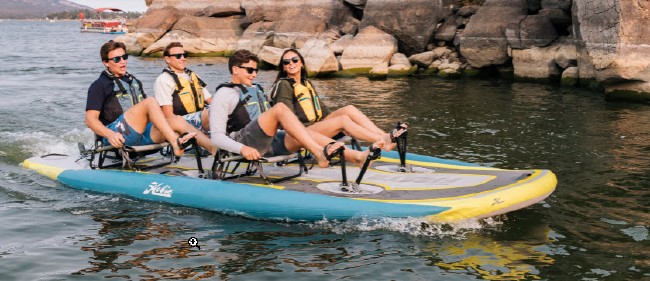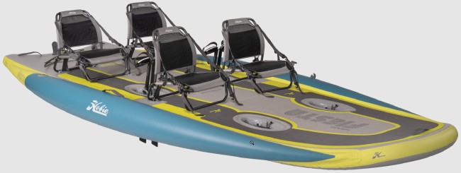 Hobie’s inflatable kayaks are portable, lightweight, agile, and lightning-fast. Powered by the MirageDrive with Glide Technology and Kick-Up Fins, the all-new iTrek Series strikes the perfect balance between superior performance and portability. Introducing the all new Mirage iTrek Fiesta. The Fiesta is fast and lightweight, but Hobie didn’t stop there. It’s versatile, too! With room for the whole family, Hobie integrated social seating, making it the perfect watercraft for spending time on the water playing games or putting your feet up and hanging out. With four seats and two MirageDrives with Glide Technology & Kick-Up Fins, and its high-tech drop stitch and triple-chanber construction, you’ll have the spare and the power to bring the whole family along for the party of a lifetime. With big kids or four adults, add two optional MirageDrives and everyone hang on to your hat! State-of-the-art seating featuring cup holders and breathable nano-mesh fabric, rolling travel bag with portable hand pump and high-volume electric pump. |
