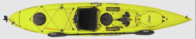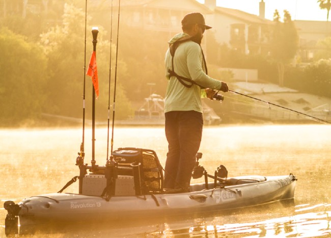 The Revolution Series showcases the true combination of speed and power. The Revos' sleek design makes them so fast and stable that no wave,wake or wind can slow them down. The Revo 13 hits the sweet spot in terms of stability, speed, and tracking performance. Its 28.5" beam enhances stability and maximizes capacity without slowing you down, so you can hit the water with friends and always stay in the lead. Revos come outfitted with the industry-leading MirageDrive 180 with Kick-Up Fins and ARC Cranks, a highly adjustable Vantage CT seat, ample storage space, molded-in rod holders, and a Twist and Stow Rudder.